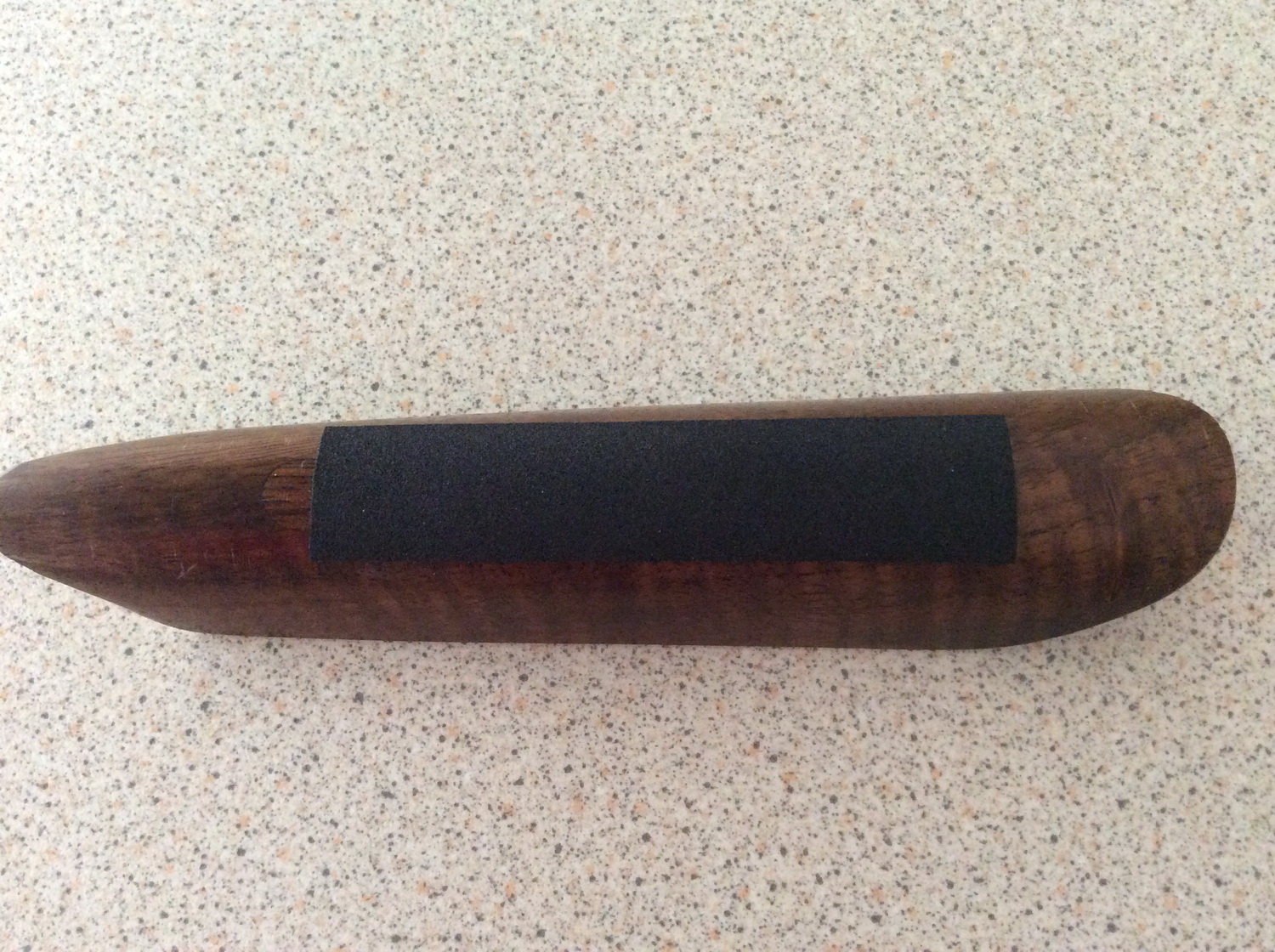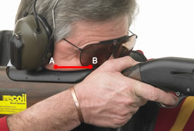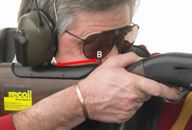 This position is frequently seen on shooting grounds worldwide. The shooter feels a firm location at (A) and is happy the gun mount is correct. However the line (A) to (B) should be located along the comb to give a repeatable eye/rib alignment.